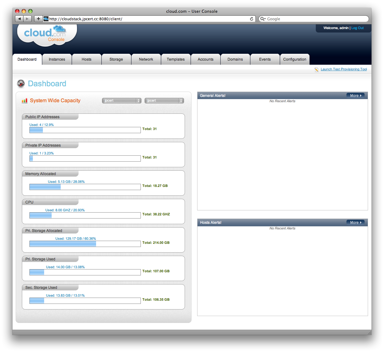 Computing Nodeの設定を正しく行なっていれば,Dashboardに利用出来るリソースが表示されています. Storageの設定 †Zoneの設定後は,Storageの設定を行ないます. Primary Storageの設定 †まず,ブラウザ上でStorage->Primary Storageと移動しAss Primary Storageをクリックします. Availability Zone : 登録するディスクスペースを利用するZoneを選択します. Pod : Availability Zoneと同じく,Zone内でも,ディスクスペースを利用するPodを選択します. Name : Primary Storageの名前を入力します.ユニークな名前であれば何でも構いません. Protocol : ディスクスペースをどのプロトコルで利用するかを選択します.Primary StorageではNFSとiSCSIが選択できます. Server : Primary Storageを提供するServerのIPアドレス,またはFQDNを入力します.ServerはManagement Serverからアクセス出来る必要があります. Path : NFSまたは,iSCSIでマウントするための,Pathを入力します. 例. Availability Zone : CloudStack Zone Pod : Public Network Name : Primary Storage for CloudStack Zone Protocol : NFS Server : 192.168.0.254 Path : /primary ここの例では,192.168.0.254のサーバが/primaryのディレクトリをNFSで提供している必要があります. Secondary Storage †次に,Secondary Storageの設定を行ないます. Availability Zone : Primary Storageを同じです. NFS Server : NFSを提供しているサーバのIPアドレス,またはFQDNを入力します.NFS ServerはManagement Serverからアクセス出来る必要があります. Path : NFSでマウントするためのPathを設定します. 例. Availability Zone : CloudStack Zone NFS Server : 192.168.0.254 Path : /secondary Primary Storageと同じく,ここの例では192.168.0.254のサーバが/secondaryのディレクトリをNFSで提供している必要があります. ここまでの設定が正しく完了すると,Management Serverがテンプレートの仮想OSイメージをダウンロードします. ダウンロードが完了したら,ストレージの設定は終了です. |