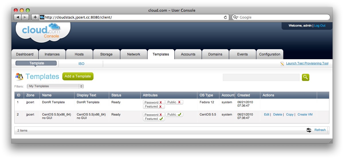 CloudStackのインストールが終わったのであれば,次にCloudStackの初期設定を行っていきます. ここからは,Management Serverで作業を行ないます. Zoneの設定 †CloudStackのインストールが終わった直後は,Zoneの設定を行っていないため,まだ仮想マシンを作成することが出来ません. Name:Zoneの名前. DNS1:Public Networkで利用出来るDNSサーバのIPアドレス. DNS2:DNS1と同じ. Internal DNS1:ローカルネットワーク内でのDNSサーバのIPアドレス.基本的にNATの構成を取るため,DNS1と同じで良い. Internal DNS2:Internal DNS1と同じ. Guest CIDR:GuestOSに割り当てるローカルIPアドレスを入力.XXX.XXX.XXX.XXX/YYの形式で入力する. 例 Name : CloudStack Zone DNS1 : 192.168.0.1 DNS2 : 192.168.0.2 Internal DNS1 : 192.168.0.1 Internal DNS2 : 192.168.0.2 Guest CIDR : 10.1.1.0/24 Zoneの設定後は,PodとPublic IP Rangeの設定を行ないます. Podの設定 †Podの設定では,PublicネットワークのIPアドレス,またその範囲を設定します. POD:そのPodを一意に示す名前を入力します.単に名前をつけるだけですので,何を入力しても構いません. CIDR:Public NetworkのIPアドレスとネットマスクを設定します.CIDRと書いてある通りXXX.XXX.XXX.XXX/XXの形式で入力します.Zoneで設定したのはLocal NetworkのIPアドレスで,ここで入力するのは,Public NetworkのIPアドレスです. IP Rangeは,CIDRで設定した中でCloudstackが割り当てるIPアドレスの範囲を設定します.入力欄が2つありますので,開始アドレスと最終アドレスを入力します. 例. POD:Public Network CIDR:192.168.0.0/24 IP Range:192.168.0.3 - 192.168.0.253 Public IP Rangeの設定 †Public IP Rangeの設定では,Public Networkの情報を入力します. Gateway : Public Networkで利用しているGatewayのIPアドレス. Netmask : Public NetworkのNetmask. IP Range : Public Networkで利用するIPアドレスの範囲.Podで設定したIP Rangeと同じ. 例. Gateway: 192.168.0.1 Netmask: 255.255.255.0 IP Range: 192.168.0.2 - 192.168.0.253 ここまで設定すると,ブラウザ上にConfigure以外のタブが表示されます.