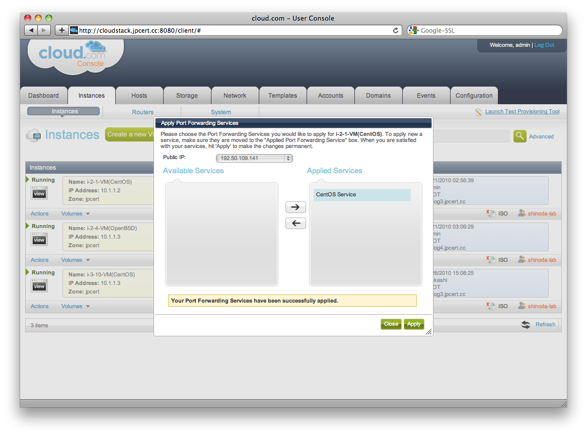 利用するPublic IPを選択し,Available ServicesからApplied ServicesへPFの設定を移動されApplyボタンで設定を保存します.