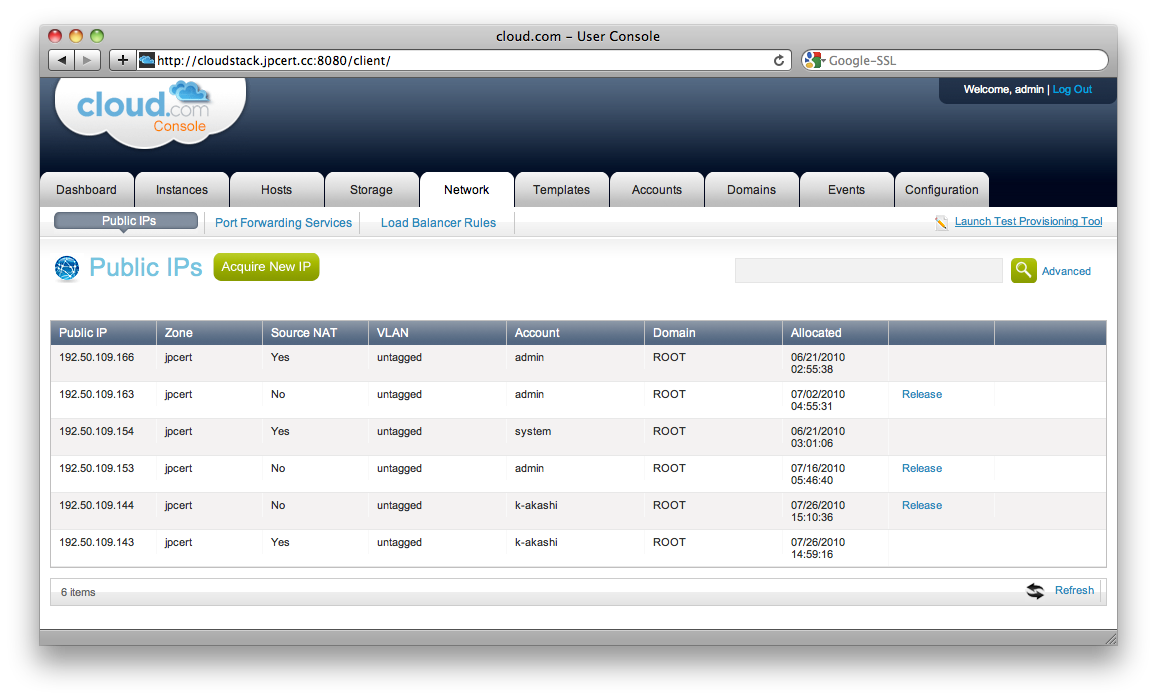 Management Serverのブラウザから,Network->Public IPsと移動し,Acquire new IPのボタンをクリックします.